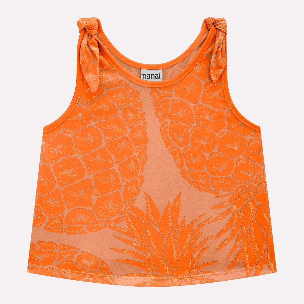 Possui estampa localizada Maxi Print de abacaxi, seguindo a super tendência de moda mundial, trazendo muito estilo para a menina Nanai. Apresenta decote redondo com acabamento em debrum, ombros com aplicação de laço, mangas regatas e barra com bainha. Perfeita para um visual moderno e alegre.