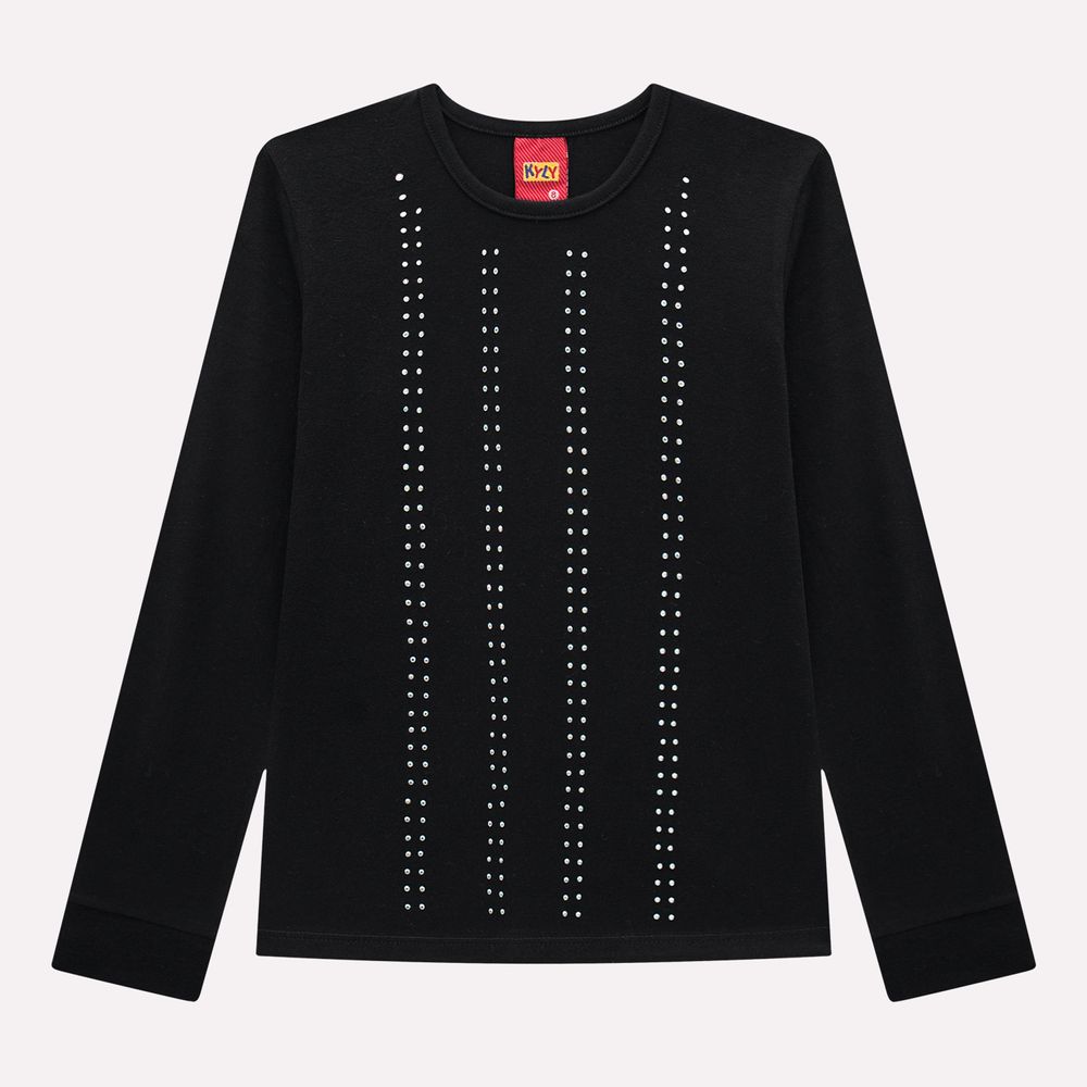 O destaque especial fica por conta da aplicação de strass em linhas verticais na parte frontal, criando um efeito sofisticado e moderno, que valoriza a peça com brilho na medida certa. As mangas longas garantem proteção nos dias mais frescos, enquanto a gola redonda com acabamento em ribana complementa o visual com um toque refinado. Versátil e elegante, é perfeita para compor looks que vão do casual ao mais arrumado, sendo ideal para momentos especiais ou produções do dia a dia com estilo.