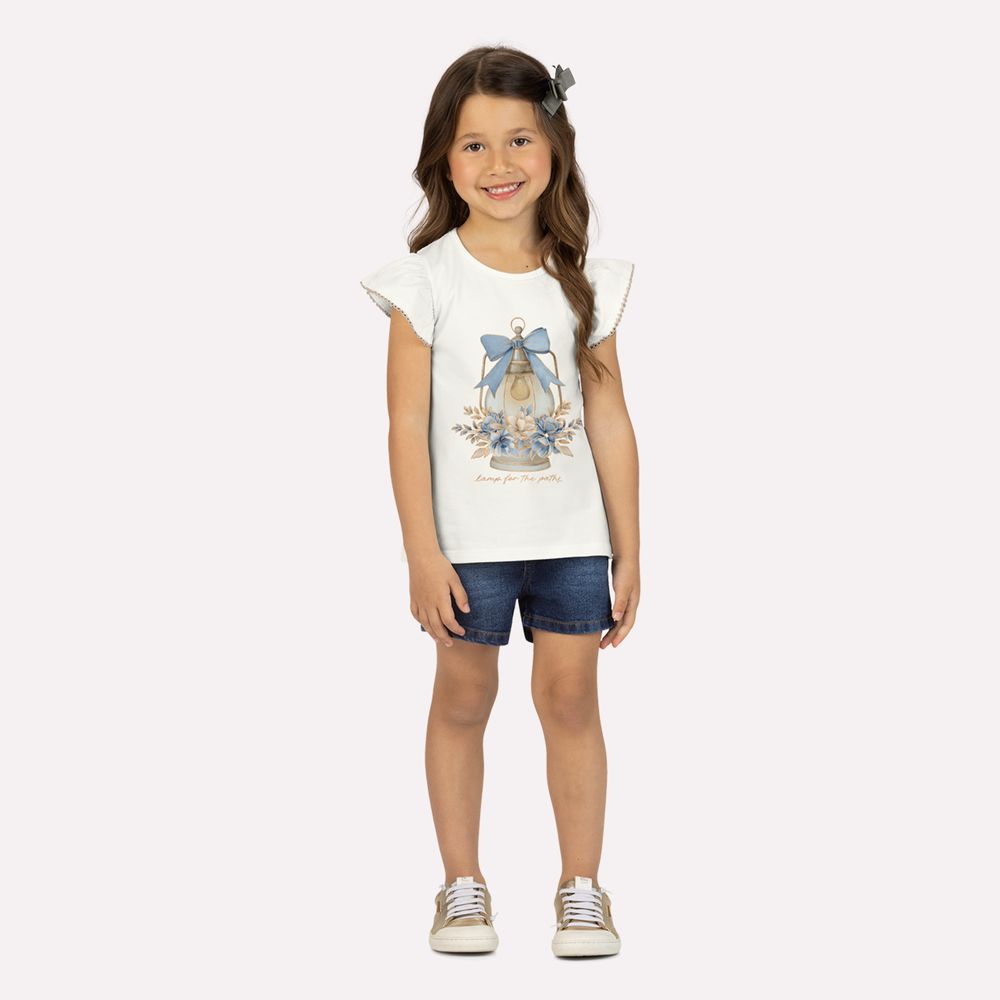 Na parte superior, o destaque fica por conta da estampa localizada de lamparina, delicadamente ilustrada e combinada com flores em tons suaves, criando um visual encantador e sofisticado. As mangas curtas com leve franzido ganham acabamento em picueta, acrescentando charme e feminilidade à peça. O decote redondo possui acabamento limpo, reforçando o cuidado nos detalhes e garantindo conforto no uso diário. Uma blusa versátil e cheia de encanto, ideal para compor looks delicados e confortáveis, trazendo a qualidade e o carinho característicos da Milon para o dia a dia das pequenas.