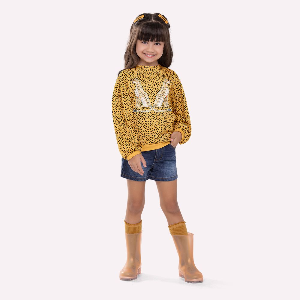 A estampa rotativa em animal print traz personalidade à peça, enquanto o destaque frontal fica por conta das onças com bordado elaborado e aplicação de lantejoulas, que adicionam textura e um brilho delicado ao visual. O acabamento conta com entretela de proteção no contorno do bordado, oferecendo maior conforto ao vestir. As mangas longas com punhos ajustados e a barra com acabamento em cor contrastante completam o design, criando uma proposta moderna e cheia de charme. Uma peça versátil para compor produções casuais com leggings, jeans ou saias, perfeita para meninas que amam se destacar com estilo.