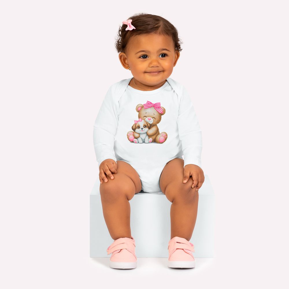 O destaque fica por conta da estampa localizada frontal com um adorável ursinho acompanhado de um cachorrinho, criando uma cena doce e afetuosa que transmite todo o universo de ternura da infância. O detalhe do laço aplicado adiciona um toque ainda mais delicado e feminino, valorizando o design da peça com charme especial. Na parte inferior, o body conta com fechamento prático entrepernas, facilitando a troca de fraldas no dia a dia. Versátil e confortável, é uma peça ideal para compor looks casuais para passeios, momentos em família ou para manter o bebê confortável durante toda a rotina.