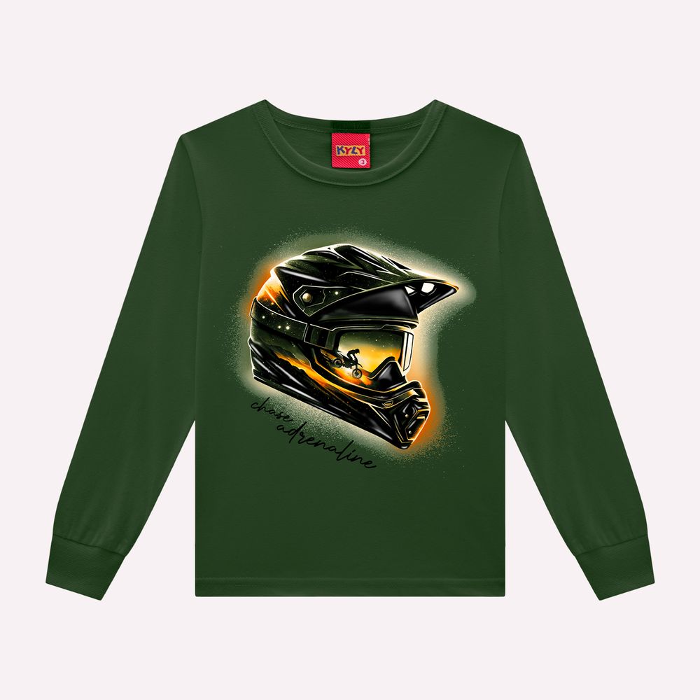 A estampa exclusiva de um capacete de motocross, com detalhes vibrantes em laranja, captura a adrenalina das pistas e traz um visual cheio de atitude. Para completar o estilo, uma frase em lettering, adicionando ainda mais personalidade à peça. Se o seu pequeno é fã de aventuras radicais, essa camiseta vai ser a escolha certa para ele arrasar no look!