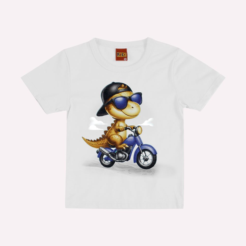 O grande destaque da peça está na sua estampa divertida e criativa, com um dinossauro estiloso pilotando uma moto, usando boné e óculos escuros. As cores vibrantes e o traço detalhado da ilustração trazem um visual moderno e cheio de personalidade.