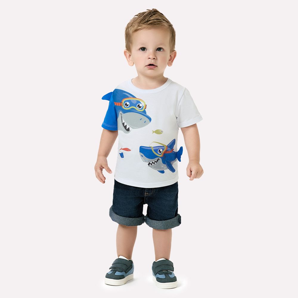 Seu diferencial está nos detalhes encantadores, a estampa frontal traz tubarões sorridentes em clima de brincadeira, acompanhados por peixinhos coloridos, em uma arte vibrante que captura o olhar. O destaque fica para o aplique em formato de barbatana, fixado estrategicamente, conferindo um efeito que estimula a imaginação e transforma a peça em um verdadeiro convite à diversão.