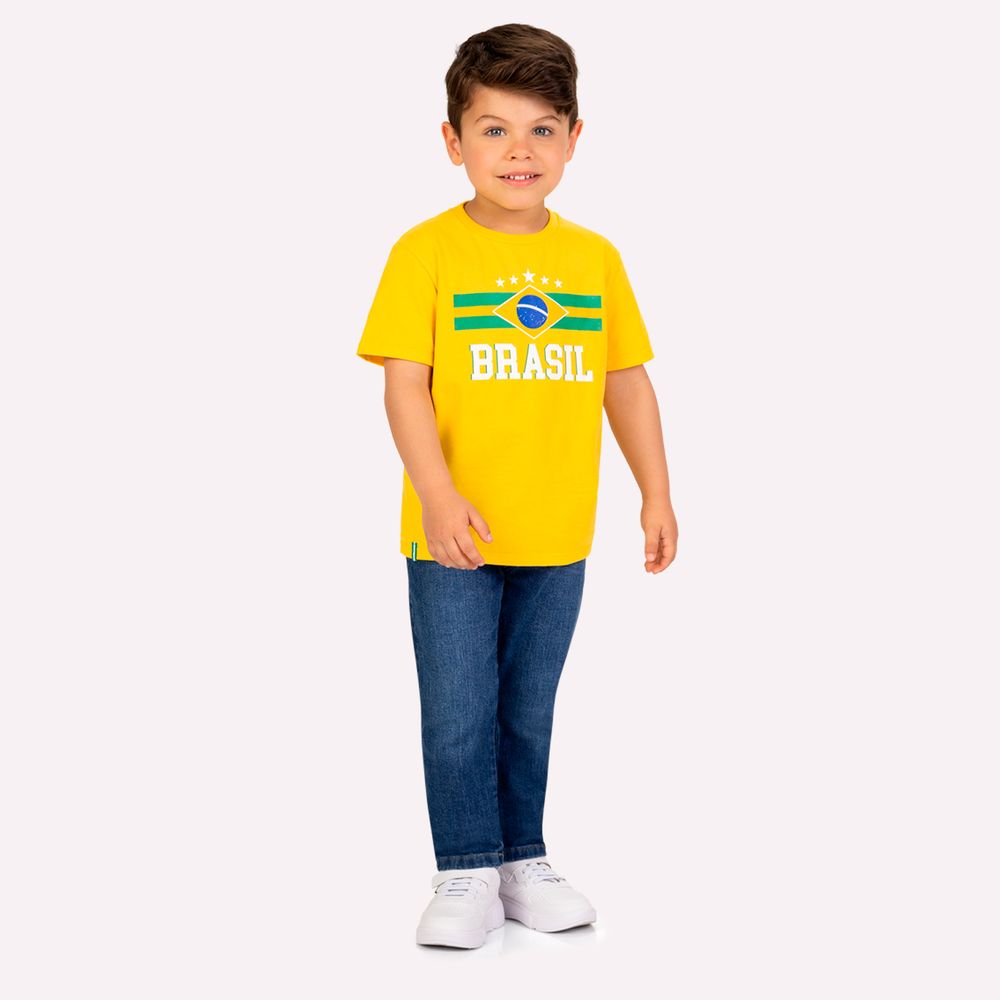 Cheia de energia e espírito esportivo, a camiseta infantil menino da Milon é perfeita para torcer com estilo e alegria. Em tom amarelo vibrante, a peça celebra a Copa do Mundo com estampa localizada da bandeira do Brasil e lettering em destaque, traduzindo o orgulho nacional em uma proposta moderna e divertida para o menino.