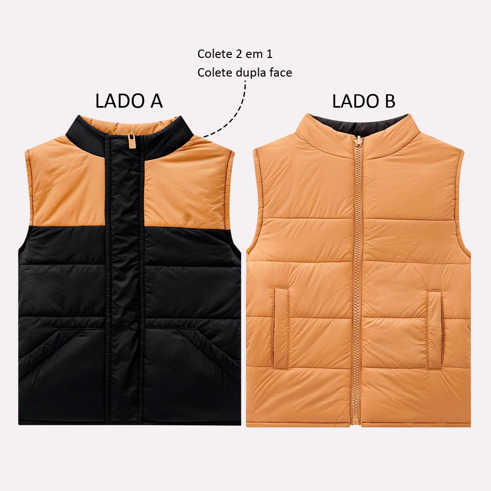 Detalhes incluem a versatilidade do colete dupla face, enchimento para maior aquecimento, fechamento frontal em zíper para praticidade, bolsos funcionais nas laterais para guardar pequenos objetos e recortes em cores contrastantes na altura do peito, proporcionando um visual moderno e estiloso para os pequenos.