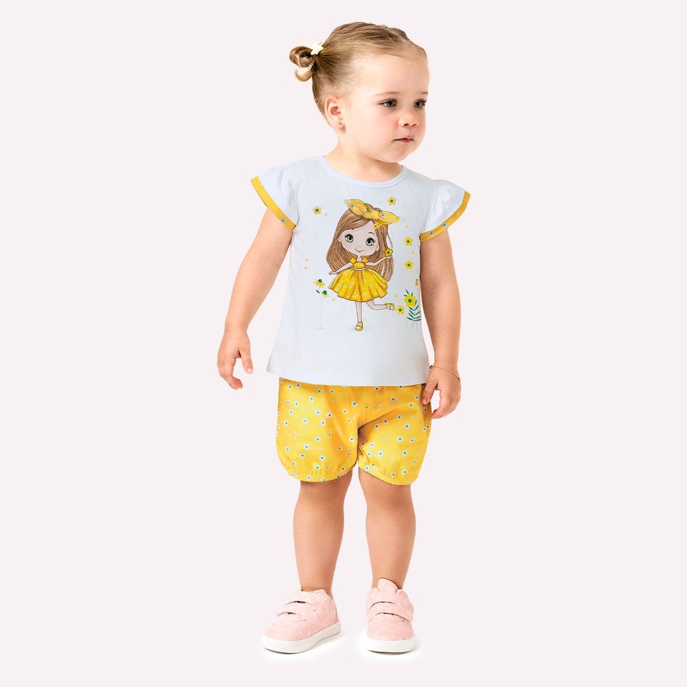 Um encanto de delicadeza para os dias mais alegres! O conjunto infantil menina Kyly combina charme e conforto em um visual perfeito para brincar e se divertir. A blusa, confeccionada em meia malha 100% algodão, possui toque macio e modelagem soltinha, garantindo frescor e liberdade de movimentos. O destaque fica por conta das mangas com babadinhos e franzido, em tecido contrastante com estampa rotativa, que trazem um efeito romântico e gracioso. A estampa localizada da menininha com vestido florido, acompanhada de delicadas flores, adiciona um toque lúdico e encantador com um laço aplicado.