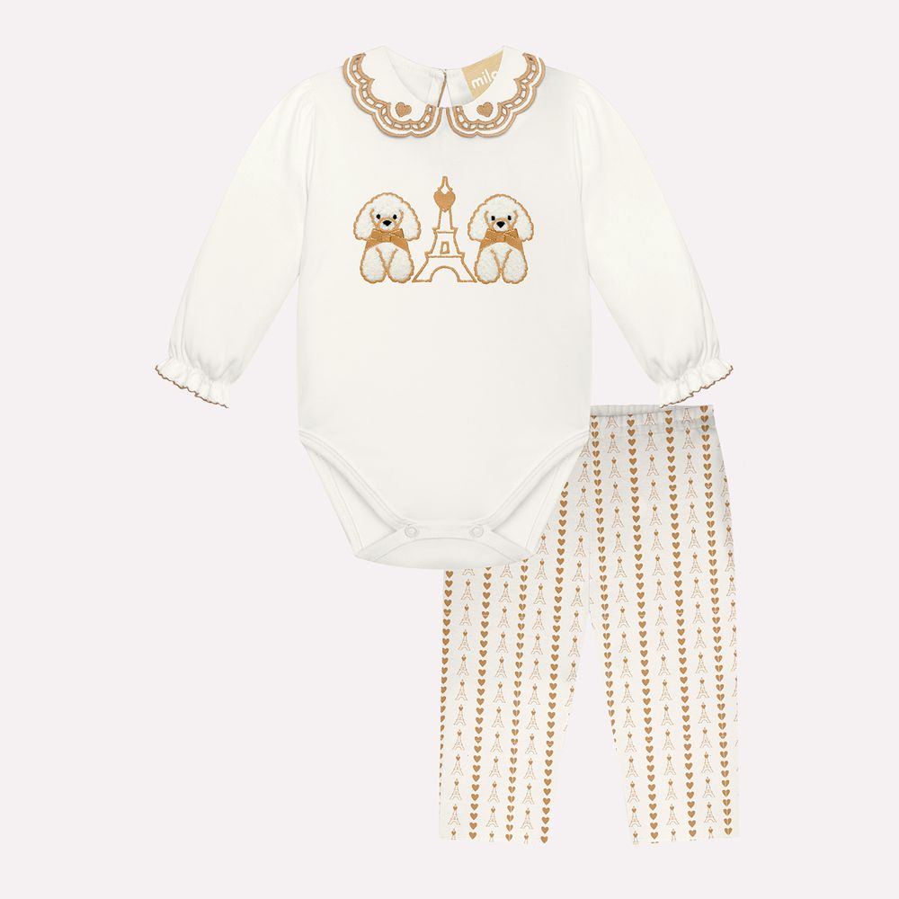 O body é confeccionado em cotton com composição de 95% algodão e 5% elastano, garantindo um toque macio, elasticidade e liberdade de movimento para o bebê. Seu design encantador apresenta bordado de cachorrinhos no centro e delicado bordado também na gola, adicionando um ar lúdico e refinado à peça. Detalhes como o acabamento em picueta nas mangas e a abertura em gota nas costas, trazem um toque romântico. Os botões de pressão na parte inferior tornam a troca de fraldas mais prática, sem comprometer o estilo.