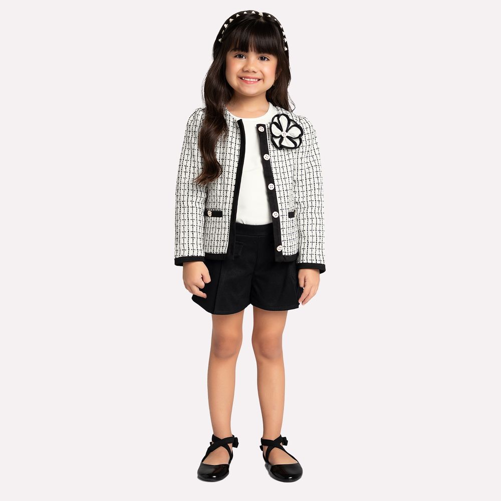 O short saia, em lã batida, segue a proposta elegante do conjunto, com uma modelagem moderna que une conforto e estilo em perfeita harmonia. A peça é confeccionada em 100% poliéster e conta com forro interno 100% algodão, o que garante um toque macio e agradável para a pele da criança, além de proporcionar estrutura e conforto térmico. Os botões decorativos adicionam um toque clássico à peça, elevando seu visual e tornando-a ideal para composições mais sofisticadas.