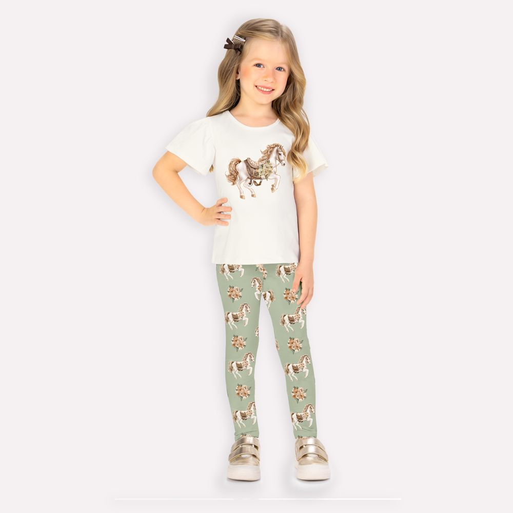A legging, confeccionada em cotton 92% algodão e 8% elastano, apresenta estampa rotativa com o mesmo tema de cavalinhos e flores, criando harmonia entre as peças. Sua modelagem ajustada ao corpo acompanha com perfeição o ritmo das pequenas, sem apertar ou limitar os movimentos, graças ao cós com elástico rebatido que garante segurança e conforto durante todo o dia. Esse conjunto é perfeito para ocasiões especiais, passeios em família ou para transformar simples momentos em memórias encantadoras.
