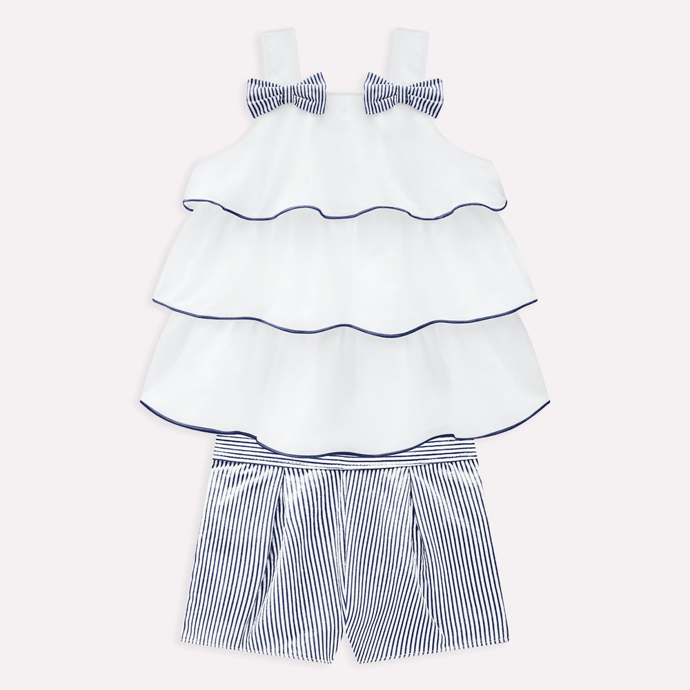 O short, confeccionado em tecido fio tinto, apresenta listras clássicas que harmonizam perfeitamente com a leveza da blusa. Sua modelagem é prática e confortável, garantindo liberdade para brincar e explorar com muito estilo. Um conjunto que combina romantismo e elegância, perfeito para acompanhar a infância em momentos de diversão e alegria!