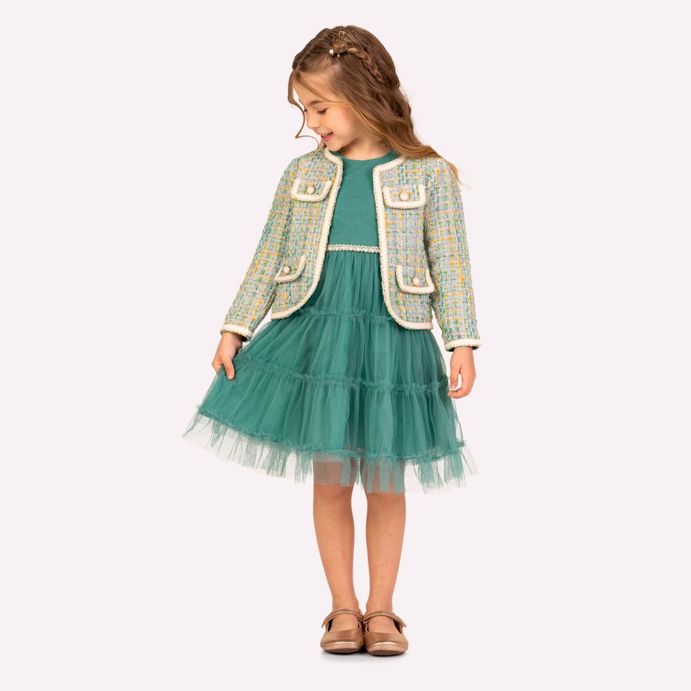 Para completar o look, o casaco em tweed adiciona um toque clássico e refinado. A peça possui bolsos frontais com botões, acabamento contrastante e estrutura elegante, ideal para deixar a produção ainda mais charmosa. Sofisticado e delicado, este conjunto infantil menina Milon é perfeito para festas, eventos especiais ou momentos inesquecíveis.