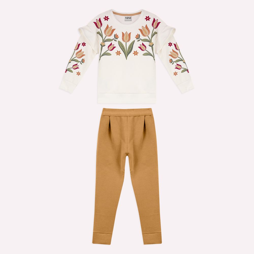 O conjunto infantil menina Nanai traduz delicadeza e aconchego em uma proposta perfeita para os dias mais fresquinhos da estação. Com design sofisticado e acabamento impecável, é a escolha ideal para compor looks casuais cheios de personalidade para menina. O casaco, confeccionado em moletom peluciado 100% algodão, oferece toque macio e acolhedor, garantindo conforto térmico com respirabilidade natural. A modelagem levemente soltinha proporciona caimento elegante ao corpo, com estrutura que valoriza os ombros e permite liberdade de movimentos. A estampa delicada de flores em destaque frontal, inspirada em tulipas, cria um visual harmonioso e encantador, remetendo à leveza da natureza. Os babados aplicados nos ombros adicionam charme e feminilidade à peça.