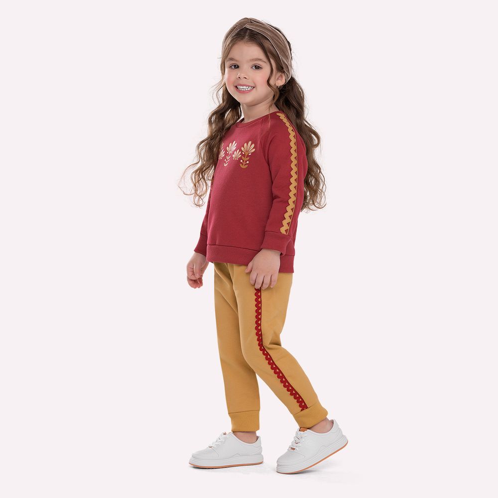 A calça em moletom peluciado 100% algodão, oferecendo o mesmo conforto térmico e toque suave. A modelagem, com cós elástico que proporciona ajuste seguro e liberdade de movimentos para o dia a dia da menina. Os aviamentos laterais adicionam personalidade ao design, criando uma harmonia visual sofisticada e moderna. O acabamento em barra canelada contribui para um caimento impecável e maior durabilidade. Este conjunto infantil menina é ideal para ocasiões casuais, passeios e momentos especiais no inverno, unindo qualidade, estilo e conforto em uma proposta versátil e encantadora.