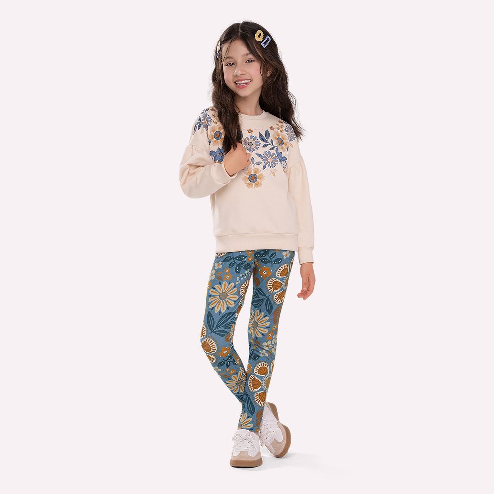 A legging complementa o conjunto com praticidade e liberdade de movimentos. Confeccionada em cotton com 94% algodão e 6% elastano, possui modelagem ajustada ao corpo, garantindo conforto e flexibilidade. A estampa rotativa de flores distribui-se harmoniosamente por toda a peça, trazendo alegria e personalidade ao visual. O cós com elástico embutido assegura encaixe confortável e seguro. Este conjunto traduz cuidado na escolha dos tecidos, atenção à modelagem e riqueza nos detalhes. Ideal para produções casuais com toque sofisticado, une funcionalidade e charme na medida certa. Uma combinação pensada para vestir a infância com conforto, leveza e delicadeza em todos os momentos.