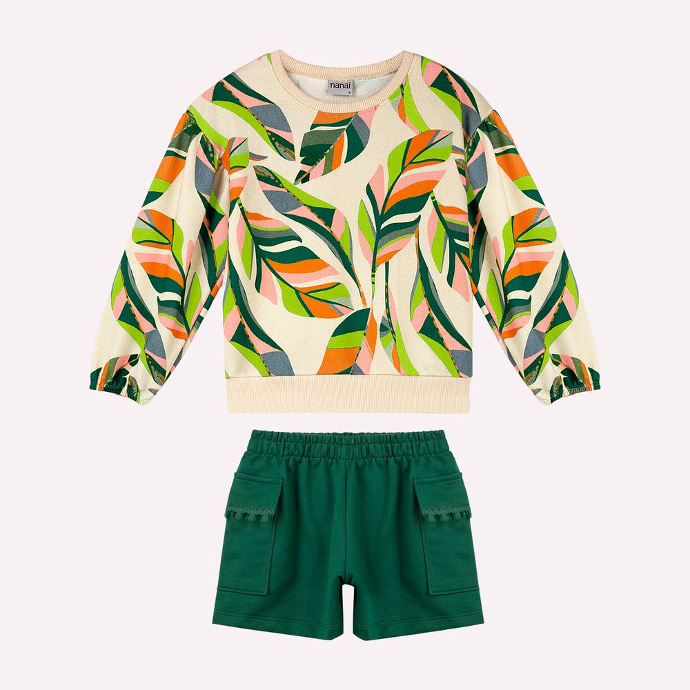 O short, em moletom sem felpa 100% algodão, complementa o conjunto com proposta versátil e funcional. Sua modelagem reta, com leve amplitude nas pernas, proporciona caimento equilibrado e liberdade de movimentos. O cós com elástico embutido garante ajuste confortável e prático, ideal para a rotina ativa da menina. Os bolsos frontais aplicados com aviamentos, agregam estilo e utilidade, enriquecendo o design com um toque contemporâneo e bem estruturado. Este conjunto infantil menina une, modelagem confortável e estampa de folhagem sofisticada, sendo perfeito para ocasiões casuais, passeios ao ar livre e produções cheias de personalidade nas estações de transição.