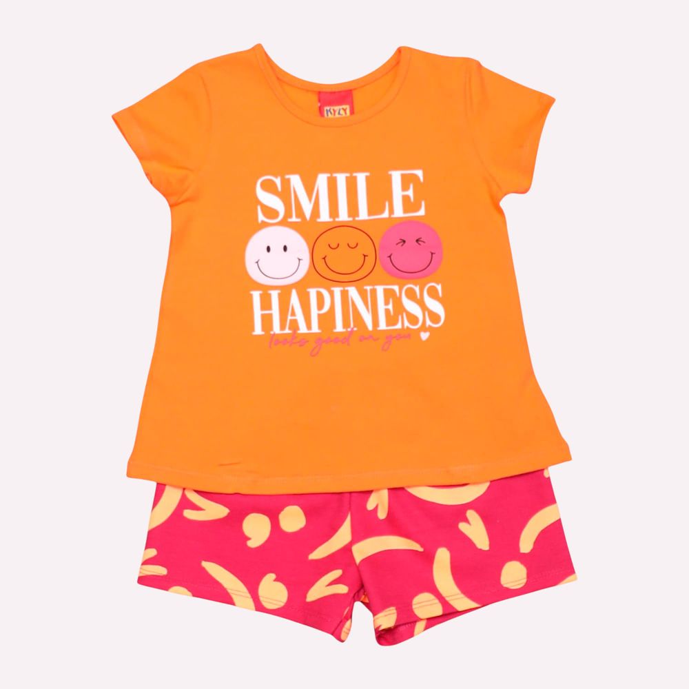 Um sorriso que contagia! O conjunto infantil menina Kyly conta com blusa confeccionada em cotton 95% algodão e 5% elastano, trazendo um toque macio e fresquinho para a pele. A estampa divertida com lettering "Smile & Happiness" e carinhas alegres deixa o visual moderno e cheio de personalidade. Sua modelagem soltinha com decote redondo e manga curta proporciona conforto nos movimentos, enquanto a malha de qualidade garante durabilidade para as aventuras do dia a dia.