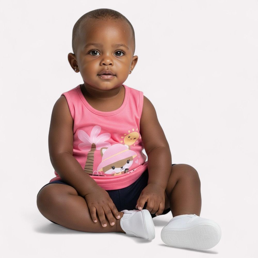 O conjunto infantil menina Kyly conta com regata em malha 100% algodão, super macia e respirável, apresenta decote redondo e cavas em debrum. Sua estampa exclusiva traz um bichinho divertido em clima praiano, remetendo a férias, sol e diversão à beira-mar.
