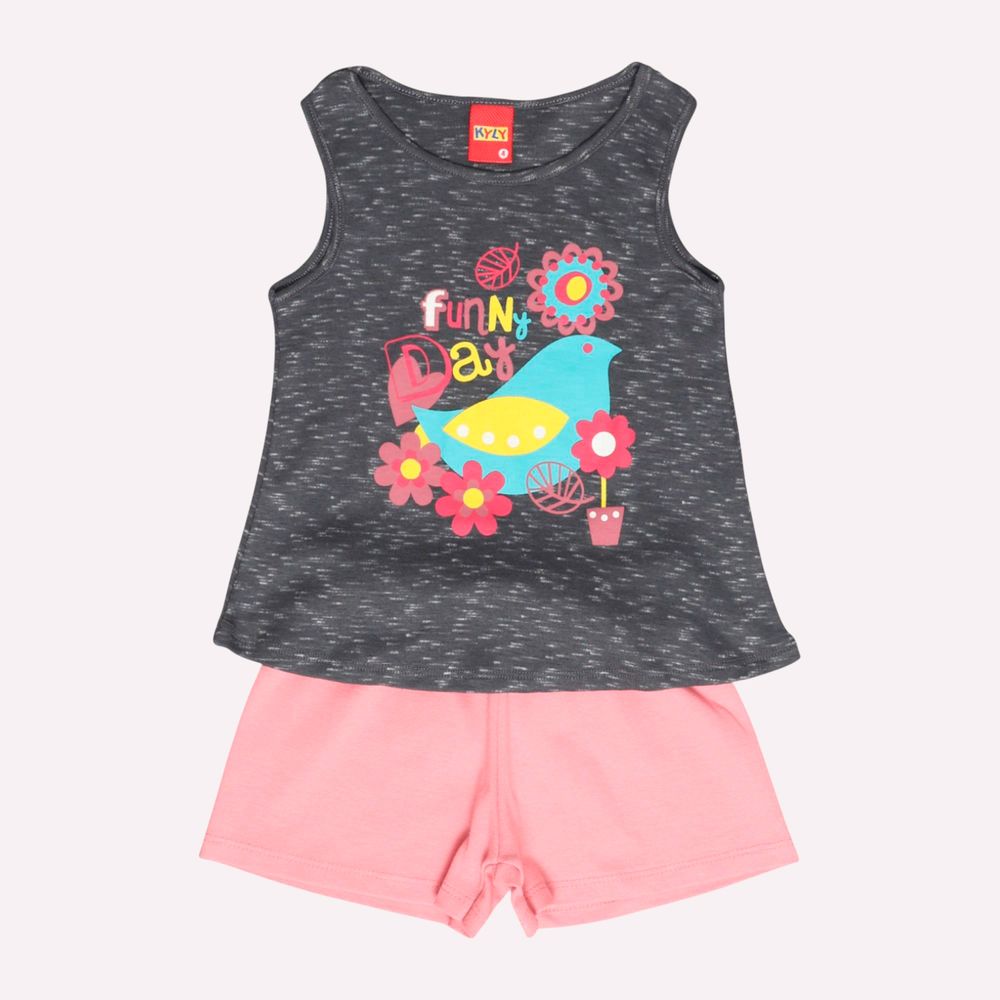 Um toque divertido e cheio de energia! O conjunto infantil menina Kyly é composto por uma regata em ribana 100% algodão com estampa de passarinho e lettering, trazendo um visual moderno e cheio de personalidade. O caimento confortável da peça combina decote redondo com acabamento em debrum, perfeito para os dias de brincadeira.