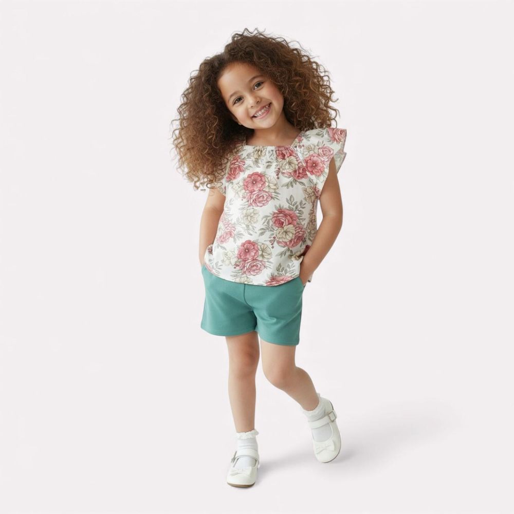 A blusa infantil menina confeccionada em 95% algodão e 5% elastano apresenta modelagem soltinha, com mangas godê e franzido delicado no decote finalizados em elástico, criando um caimento gracioso e cheio de charme. A estampa rotativa de flores traz um ar romântico e sofisticado, perfeito para ocasiões especiais ou passeios em família.
