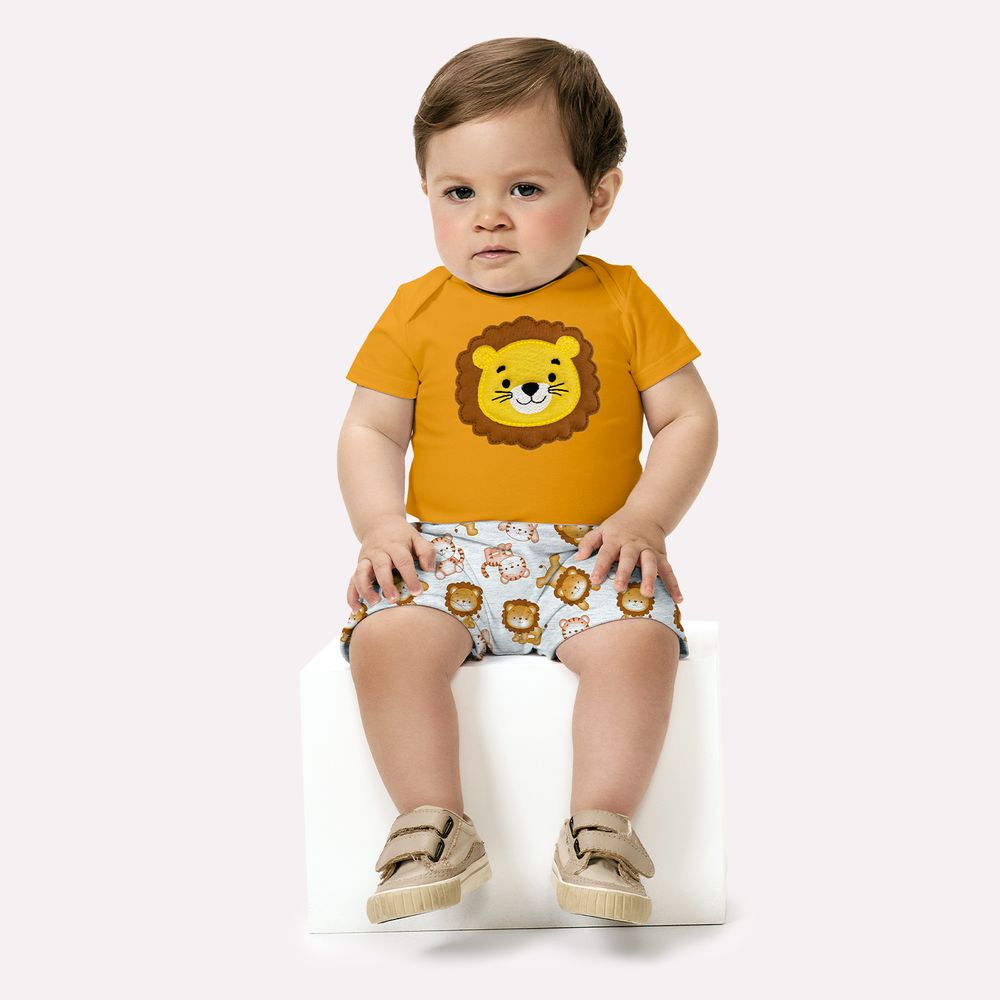 O body é confeccionado em cotton 95% algodão e 5% elastano, garantindo ajuste perfeito ao corpo do bebê com um toque suave sobre a pele. Sua modelagem anatômica com ombros transpassados e fechamento inferior com botões de pressão facilita na hora da troca. O destaque fica por conta do bordado com enchimento de leão, que traz um toque lúdico e delicado, valorizando o visual com muito carinho.