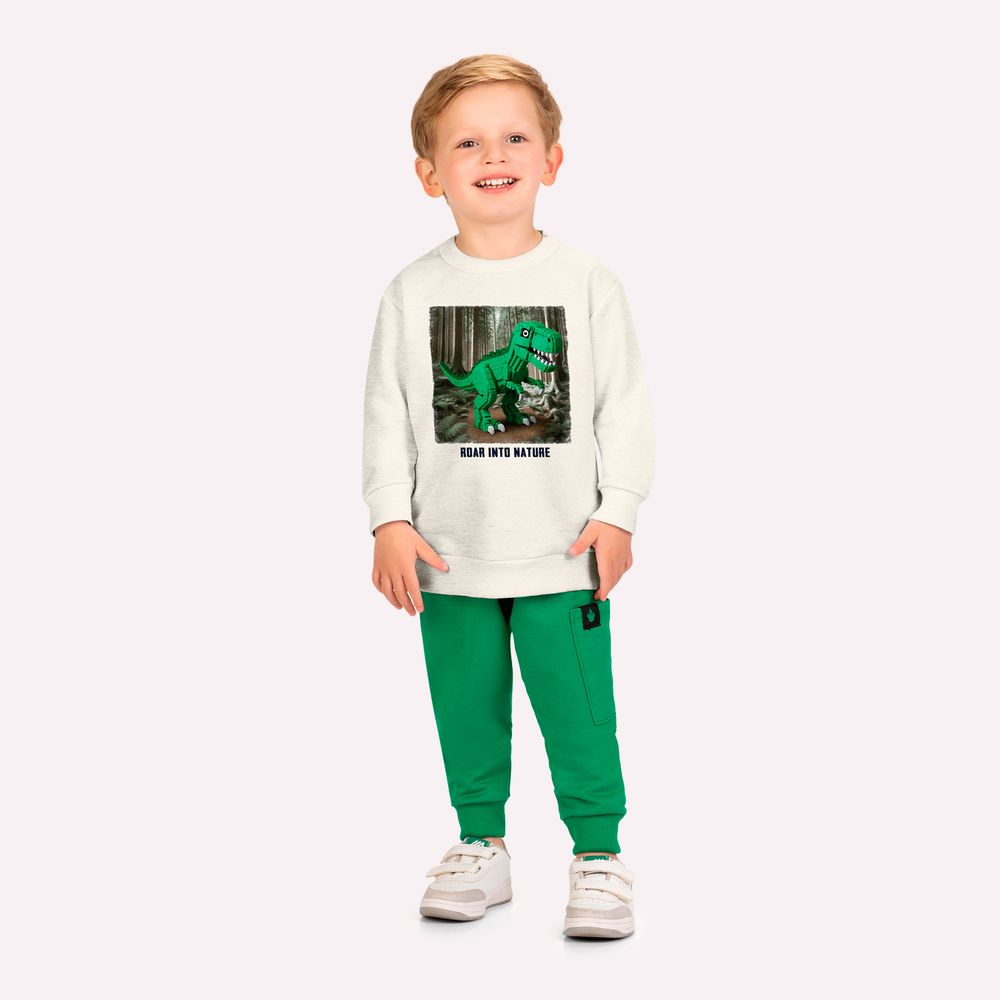 A calça, também em moletom peluciado 100% algodão, complementa o conjunto com conforto e praticidade. Sua modelagem conta com cós elástico que se ajusta suavemente à cintura e punhos nas barras que garantem um caimento alinhado. O bolso lateral funcional adiciona um toque utilitário ao visual, além de praticidade para o dia a dia. Um conjunto infantil menino ideal para passeios, escola e momentos de lazer, unindo conforto, estilo e uma proposta divertida para as estações mais amenas.