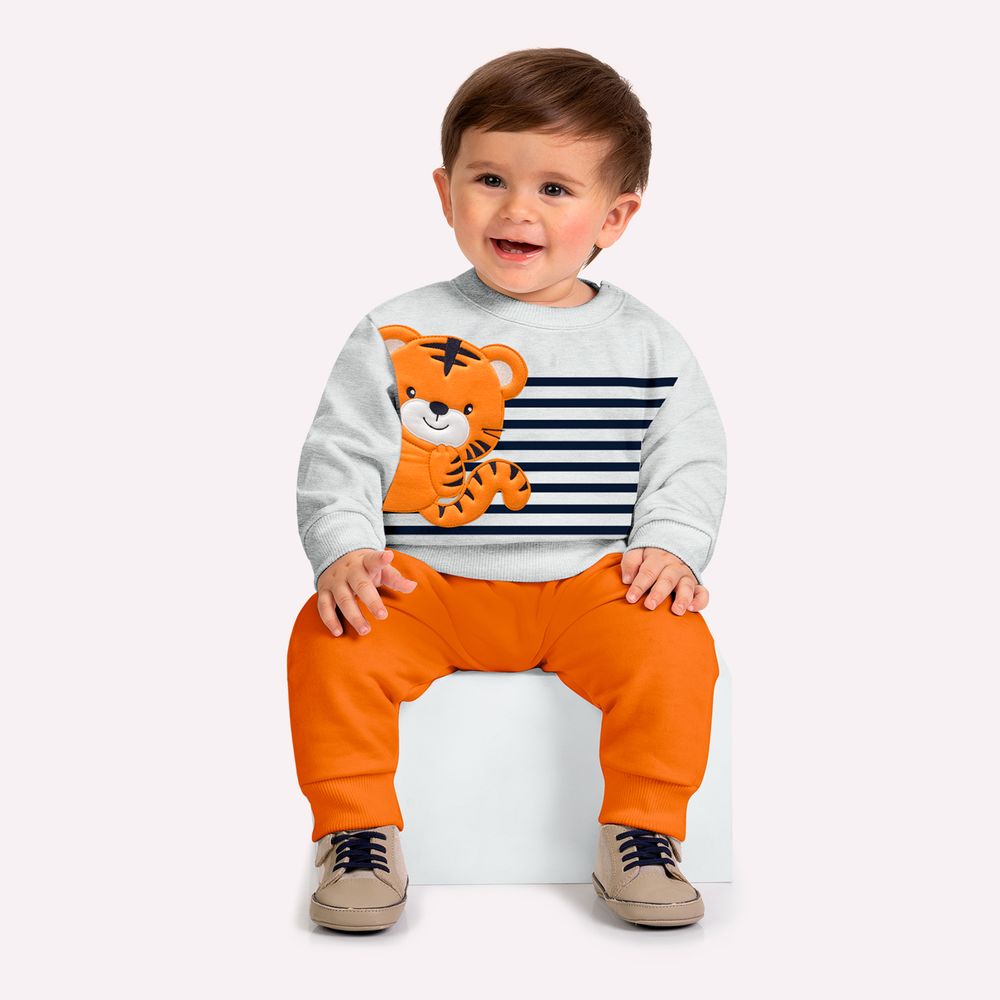 A calça, também confeccionada em moletom peluciado 100% algodão, completa o conjunto com conforto térmico e praticidade para o cotidiano do bebê. Possui cós com elástico que se ajusta suavemente à cintura e punhos nas barras que ajudam a manter o caimento alinhado. O bordado de tigre na parte traseira adiciona um detalhe divertido e harmoniza perfeitamente com a temática da blusa. Um conjunto bebê menino ideal para passeios, momentos de descanso e brincadeiras, garantindo aconchego e estilo durante as estações mais amenas.