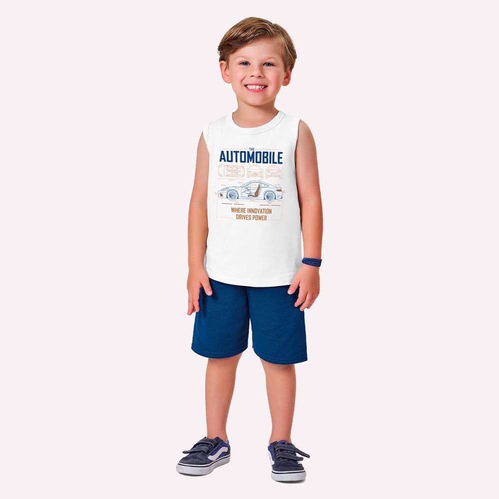 O conjunto infantil menino Kyly une conforto, estilo e um visual moderno, perfeito para acompanhar o dia a dia dos pequenos com leveza. A regata é confeccionada em meia malha 100% algodão, proporcionando toque macio, frescor e excelente respirabilidade. Sua modelagem confortável conta com cavas bem estruturadas e caimento soltinho, garantindo liberdade total de movimentos. A estampa localizada de carro com lettering traz um visual atual e sofisticado, aplicada de forma equilibrada para valorizar a peça sem excessos.
