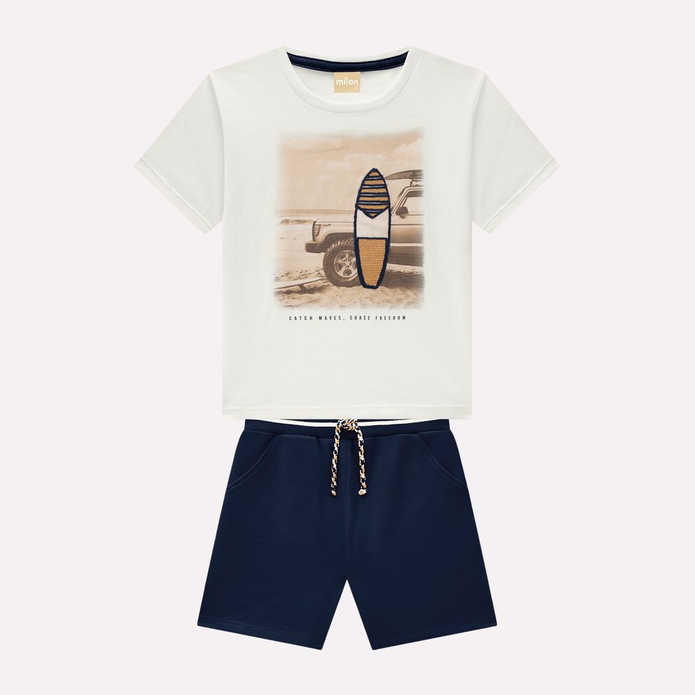 O conjunto infantil menino Milon traz o espírito livre da praia em um visual moderno e cheio de conforto, ideal para explorar o dia com muito estilo.