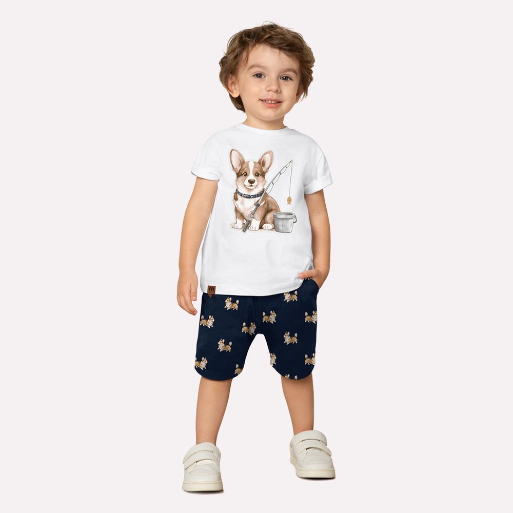 O conjunto infantil menino Milon é um charme divertido para brincar e encantar. A camiseta em meia malha 100% algodão é leve, respirável e muito macia ao toque, perfeita para os dias de diversão. Sua modelagem clássica com gola redonda valoriza o caimento e o destaque fica por conta da estampa localizada do cachorrinho corgi com balde e vara de pesca, acompanhada da técnica de embossing, que traz relevo sofisticado e torna a peça ainda mais especial.