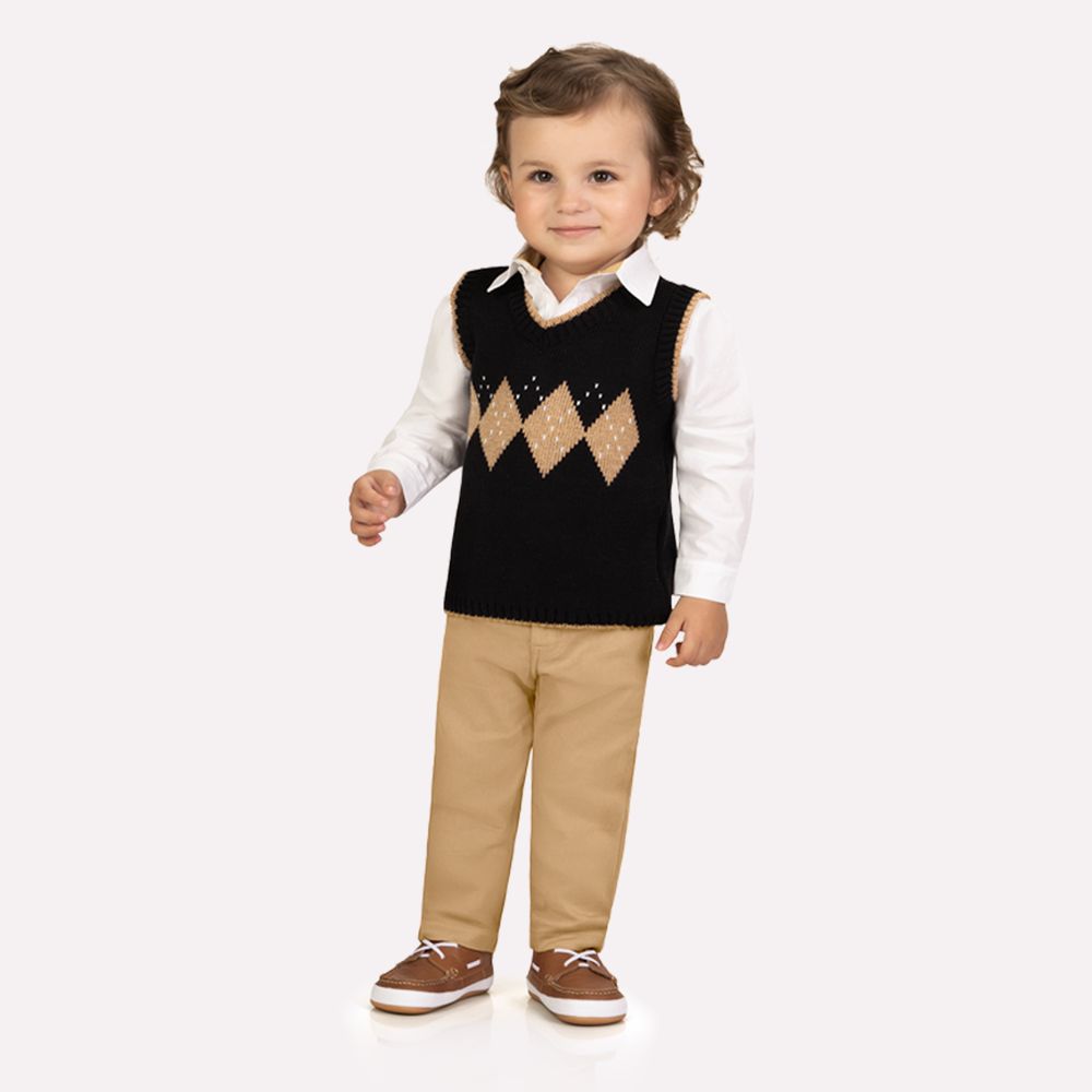 O colete em tricô, composto por 50% algodão e 50% acrílico, adiciona um toque clássico ao conjunto. O destaque fica por conta do padrão geométrico frontal em estilo argyle, que traz personalidade e sofisticação ao look. Completando a produção, a calça em sarja com 97% algodão e 3% elastano oferece conforto e liberdade de movimento, além de um caimento alinhado ideal para momentos especiais. Um conjunto infantil masculino Milon perfeito para festas, eventos e ocasiões em que estilo e elegância fazem toda a diferença.