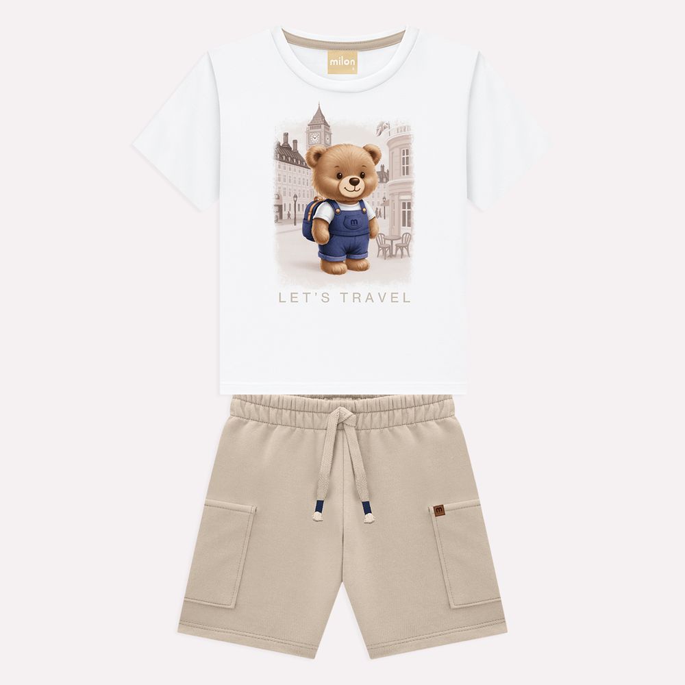 O conjunto infantil menino Milon traduz conforto, estilo e um visual delicado, ideal para o dia a dia com um toque sofisticado. A parte superior é composta por camiseta em meia malha 100% algodão, oferecendo toque macio, respirabilidade e excelente conforto térmico. A modelagem é clássica e confortável, com mangas curtas e gola redonda que garantem ótimo caimento. A estampa localizada de ursinho traz um visual lúdico e afetuoso, enriquecida por detalhes suaves que valorizam a peça, perfeita para composições versáteis e modernas.