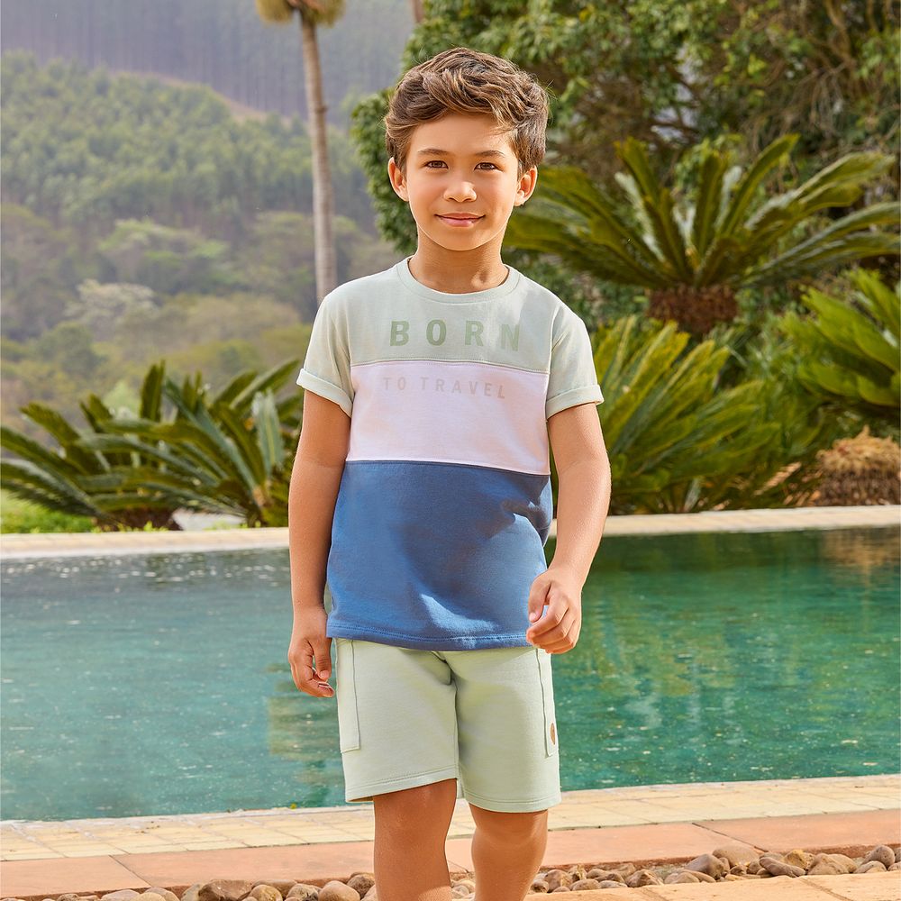 A parte superior é composta por camiseta em meia malha 100% algodão, oferecendo toque macio, respirabilidade e excelente conforto térmico. A modelagem é confortável, com mangas curtas e gola redonda, proporcionando ótimo caimento. A estampa localizada com lettering adiciona um visual contemporâneo e discreto, valorizando a peça com sutileza e equilíbrio.
