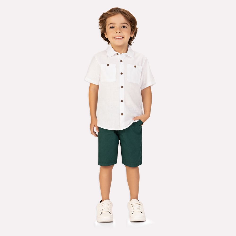 Completando o visual, a bermuda em sarja leve 100% algodão traz caimento impecável e liberdade de movimentos. Seu design moderno conta com bolsos laterais, fechamento em botão e acompanha um cinto listrado, que valoriza ainda mais o look com um toque refinado. O tom verde intenso cria um contraste elegante com a camisa, formando um conjunto versátil e cheio de estilo. Um visual encantador, perfeito para que os meninos estejam confortáveis e charmosos em festas de fim de ano e outras celebrações especiais.