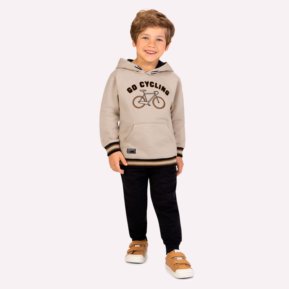O casaco é confeccionado em moletom peluciado 100% algodão, oferecendo toque macio e quentinho. O modelo conta com capuz, bolso canguru funcional e estampa frontal com lettering “Go Cycling” e bicicleta bordada, trazendo um visual divertido e contemporâneo. Os acabamentos em ribana nas mangas e barra garantem melhor ajuste ao corpo.