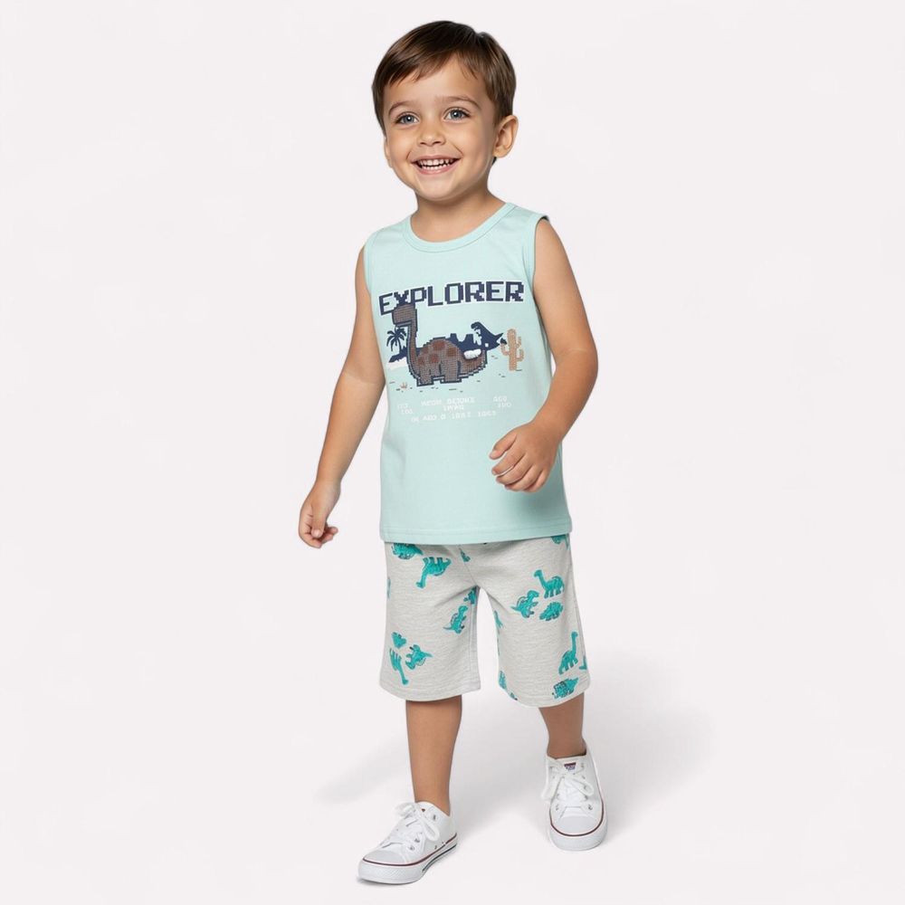O conjunto infantil menina conta com regata confeccionada em meia malha 100% algodão com estampa localizada com lettering “explorer” acompanhada de um simpático dinossauro. A modelagem sem mangas permite liberdade total de movimentos, ideal para os dias mais quentes.