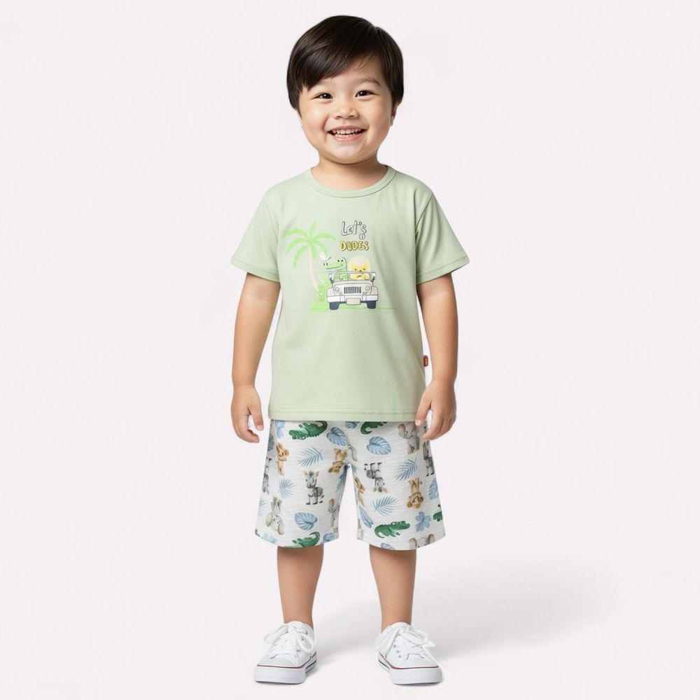 O conjunto infantil menino Kyly traz uma camiseta em meia malha 100% algodão, super macia e fresquinha, com estampa frontal de carro safari sob um coqueiro que inspira imaginação e brincadeiras cheias de histórias. O detalhe das cores alegres dá ainda mais charme e modernidade ao visual.