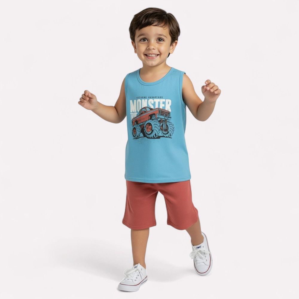 A regata em meia malha 100% algodão é leve e confortável, trazendo uma estampa vibrante de carro monster truck com lettering estilizado, que desperta a imaginação dos meninos apaixonados por carrinhos.