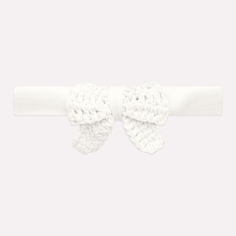O destaque especial fica para o laço de crochê aplicado na parte frontal, feito em delicado acabamento artesanal que transmite charme e sofisticação. A combinação da faixa simples e confortável com o laço romântico cria um acessório versátil, ideal para complementar desde looks casuais até produções mais especiais.