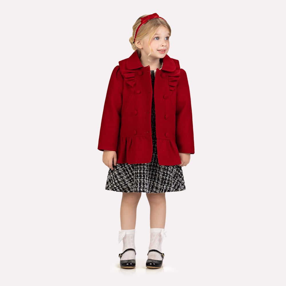Confeccionada em trench coat de tweed 100% poliéster, a peça apresenta textura elegante e estrutura refinada que valoriza o visual da menina. A modelagem levemente acinturada proporciona um caimento harmonioso no corpo, enquanto o forro interno 100% algodão garante toque macio e conforto durante o uso.