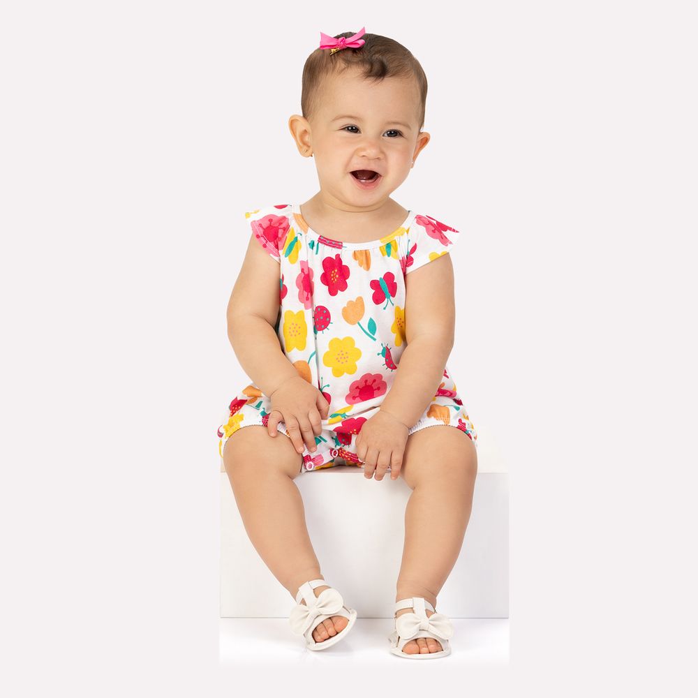 A estampa vibrante de flores, borboletas e joaninhas transforma a peça em um jardim encantado, cheio de cores e diversão. A modelagem é soltinha e confortável, com mangas franzidas e detalhe de elástico no decote e nas perninhas, proporcionando ótimo ajuste sem apertar. Além disso, o fechamento prático na parte inferior facilita na hora de vestir e trocar o bebê, sem perder o charme. Delicado, alegre e confortável, esse macaquinho é um verdadeiro convite para brincar e explorar o mundo com leveza e muito estilo!