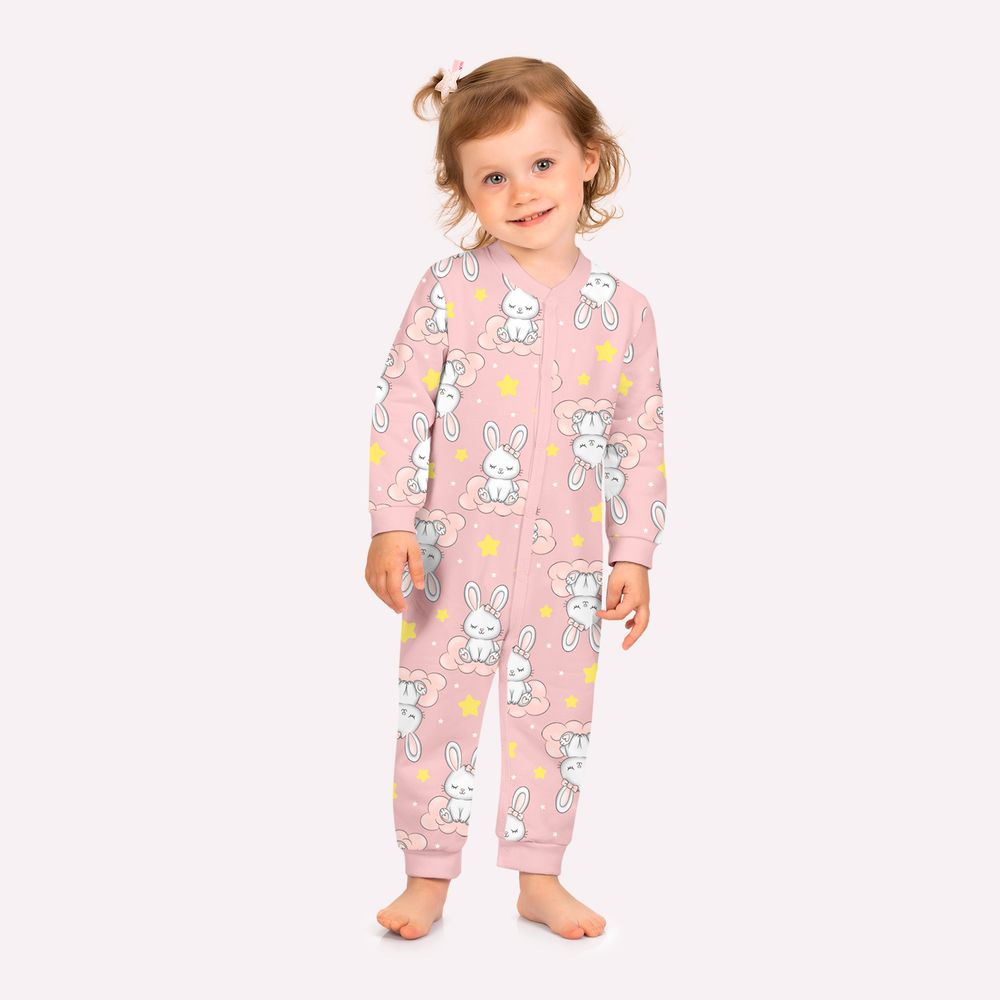 O design apresenta estampa rotativa de coelhinhos acompanhados por pequenas estrelas, criando uma composição delicada e divertida inspirada no universo infantil. O fechamento frontal com botões traz praticidade ao vestir, além de adicionar um toque clássico e charmoso ao visual. Os punhos e barras com acabamento ajustado contribuem para um caimento confortável e ajudam a manter o calor durante a noite. Perfeito para noites aconchegantes, este pijama infantil da Kyly combina conforto, suavidade e um visual encantador, ideal para acompanhar as meninas em momentos de descanso cheios de carinho.