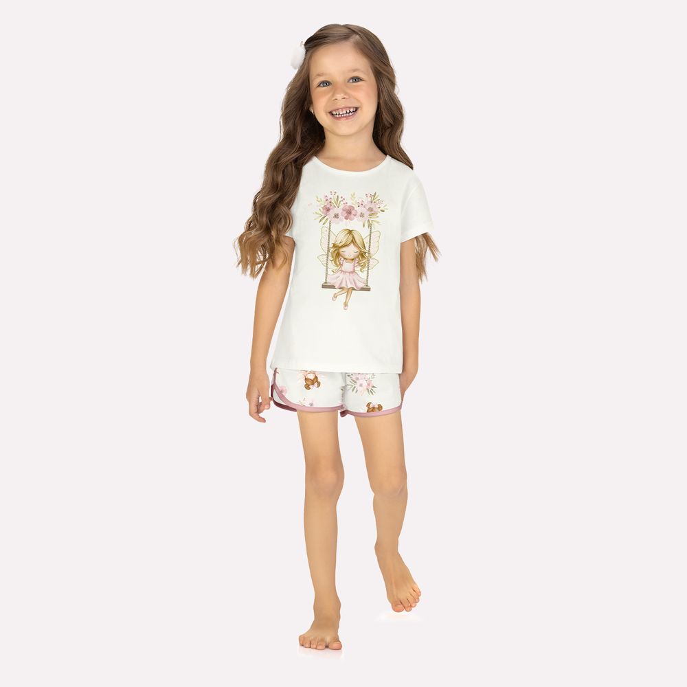 A blusa de manga curta, traz estampa delicada de fada em balanço rodeada por flores, que além de encantadora, conta com efeito que brilha no escuro, tornando o momento de dormir ainda mais divertido e especial. A modelagem soltinha proporciona liberdade de movimentos e muito conforto.