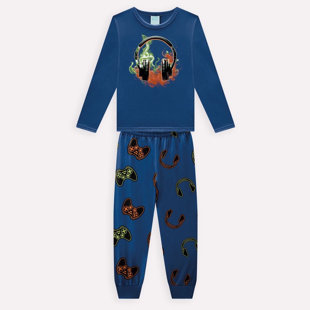 O pijama Infantil menino brilha no escuro Kyly, uma peça sofisticada e moderna, cuidadosamente confeccionada em meia malha 100% algodão, que proporciona um toque suave e envolvente, perfeito para garantir conforto e liberdade durante o sono e os momentos de lazer. A camiseta se destaca com uma estampa exclusiva de um fone gamer, símbolo da paixão pelo universo digital, conferindo um ar contemporâneo e ousado ao conjunto.