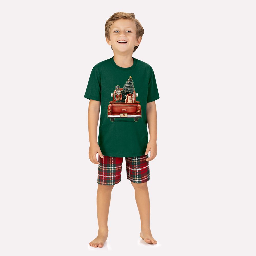 A camiseta verde traz uma estampa exclusiva com tema natalino, uma charmosa caminhonete vermelha carregada de presentes e uma árvore de Natal. O destaque especial fica por conta do detalhe que brilha no escuro, tornando a hora de dormir ainda mais divertida e mágica.