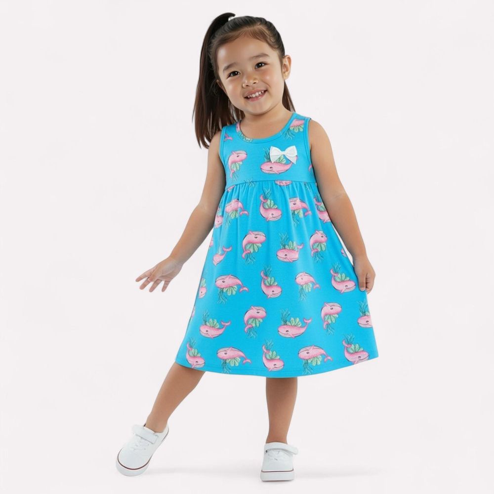 O vestido infantil menina Kyly é confeccionado em meia malha 100% algodão, este vestido levemente godê e soltinho, traduz o espírito do verão. Sua estampa remete à praia, trazendo estampas tropicais em cores alegres e vibrantes.