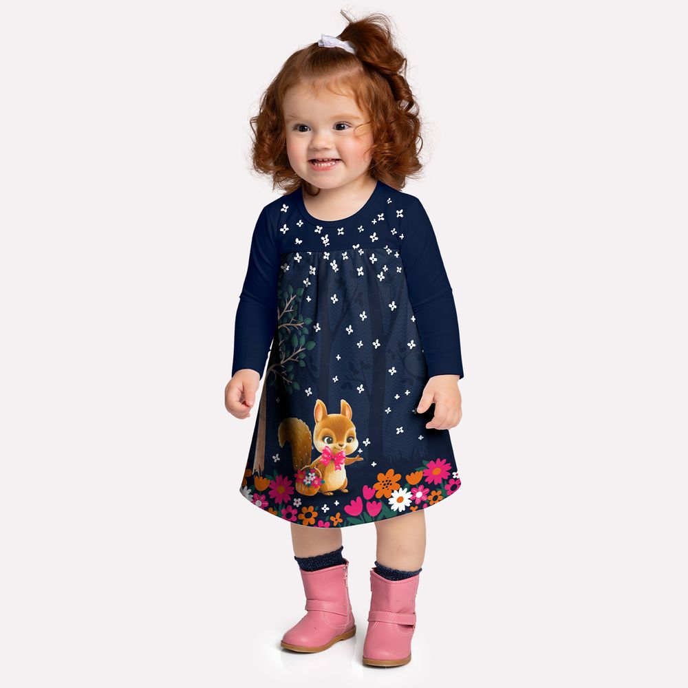 O vestido infantil menina Kyly é confeccionado em cotton 95% algodão e 5% elastano. Com modelagem soltinha e mangas longas, oferece praticidade e liberdade de movimento para sua pequena.