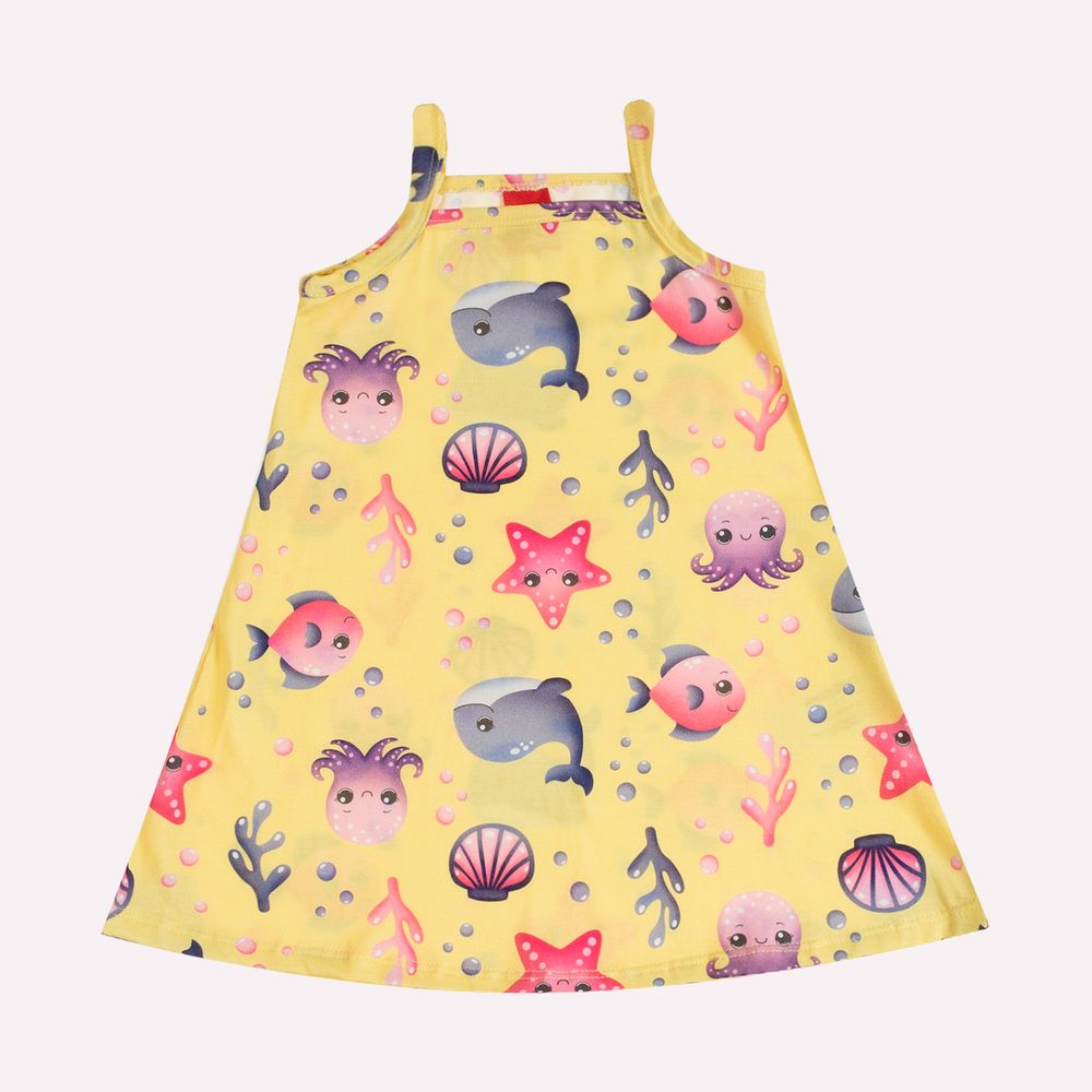 O destaque do modelo fica por conta da estampa, que transforma o vestido em uma verdadeira imersão lúdica no mundo subaquático. Peixinhos, baleias, estrelas-do-mar, conchas e bolhas compõem um cenário encantador em cores vibrantes, despertando a imaginação infantil e tornando o look ainda mais divertido. Perfeito para passeios, festas ao ar livre e momentos especiais do dia a dia, este vestido une estilo lúdico, conforto e qualidade em uma peça encantadora e atemporal.