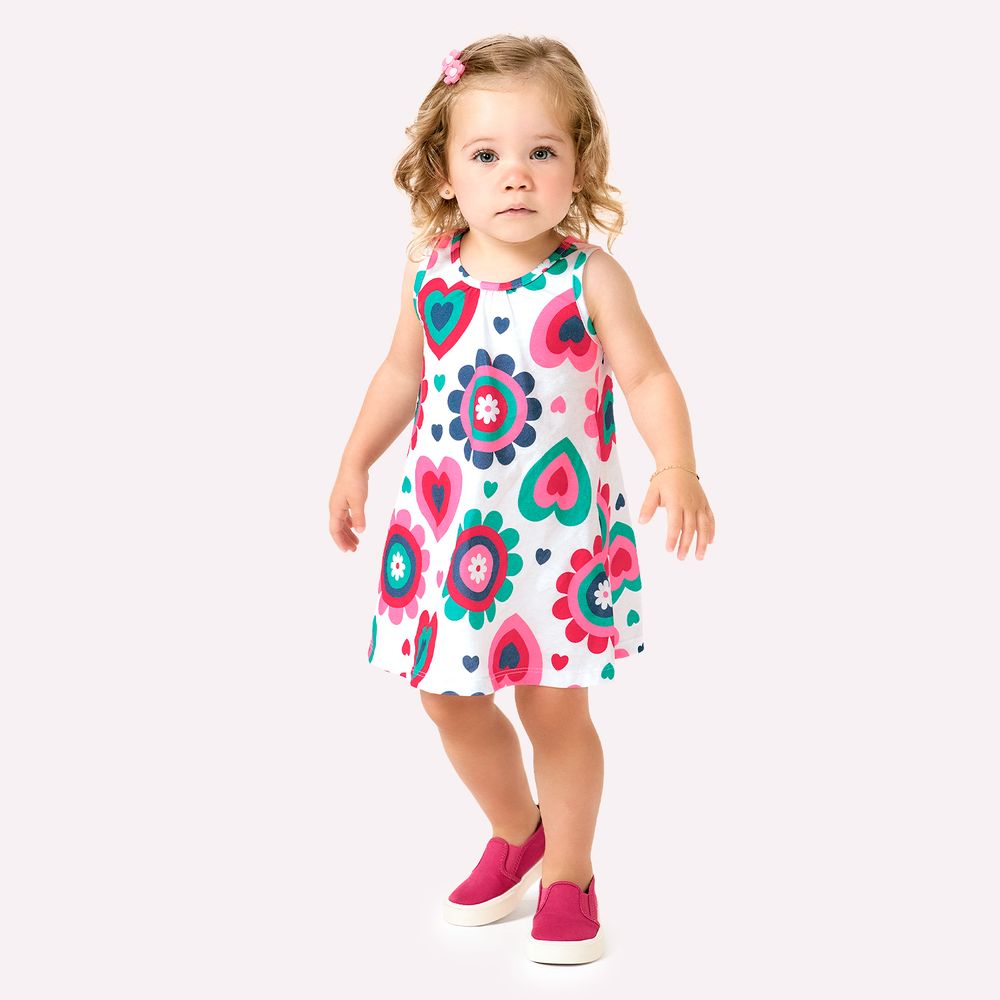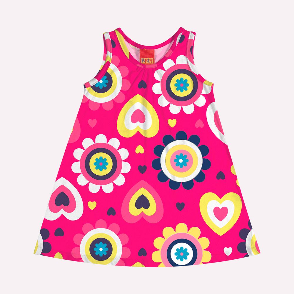 Seu visual é marcado por uma estampa rotativa com flores e corações em tons vibrantes, criando um efeito visual lúdico e encantador. O decote frontal conta com franzido delicado, adicionando volume e feminilidade na medida certa, enquanto o acabamento em debrum nas cavas e no decote assegura estrutura e sofisticação à peça. Um vestido que une estilo, conforto e personalidade, ideal tanto para ocasiões especiais quanto para o dia a dia das meninas que adoram cores, movimento e alegria.