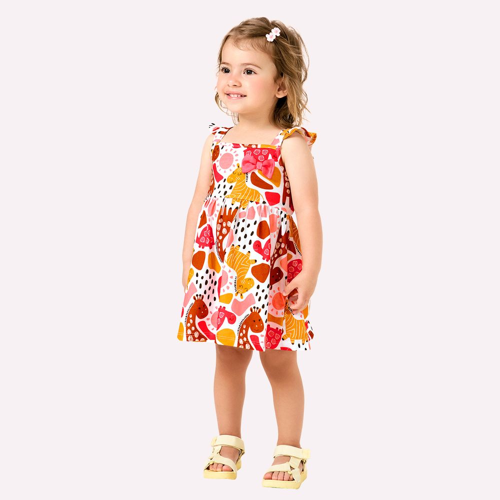 O vestido infantil menina Kyly é uma explosão de fofura e conforto. Confeccionado em meia malha 100% algodão. Com uma modelagem que une charme e praticidade, a peça apresenta um caimento fluido e volumoso que valoriza o visual infantil. A estampa rotativa com bichinhos divertidos e coloridos traz um ar lúdico e encantador à composição.